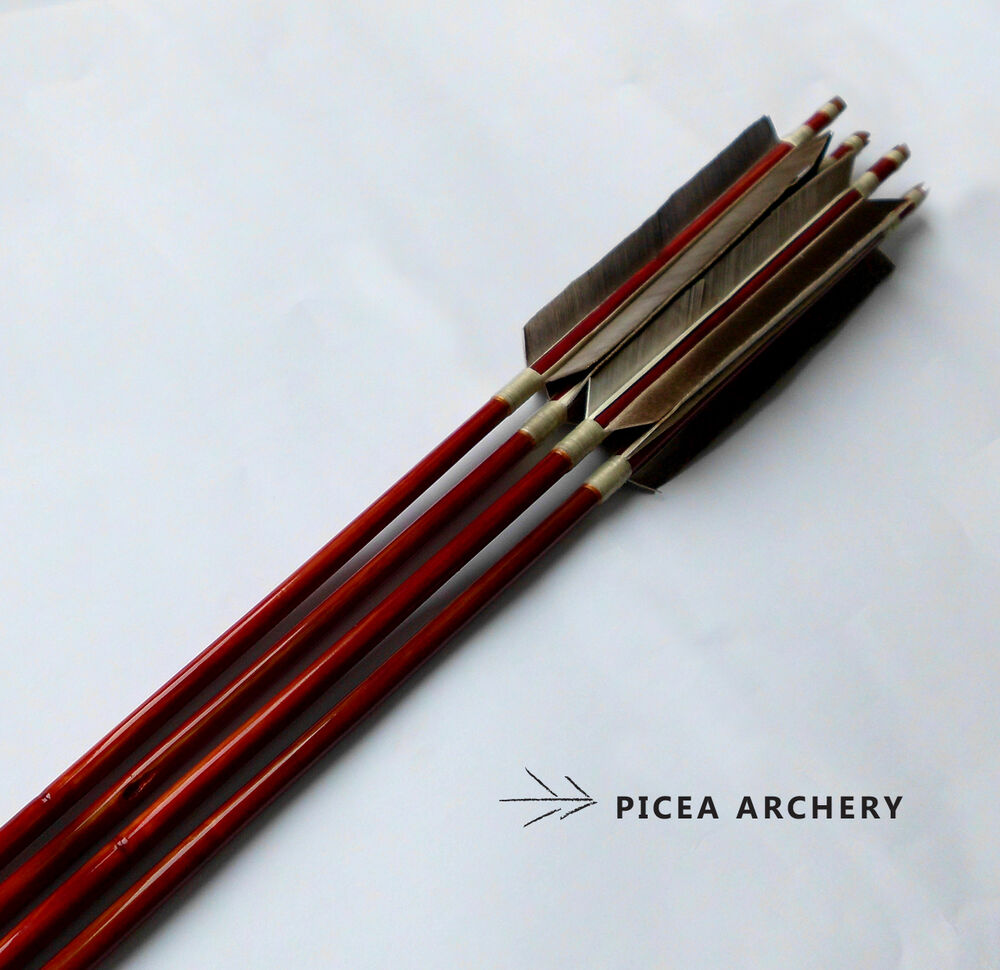 Strzały z bambusa Pseudosasa Japonica, lakierowane na czerwono. Lotki z naturalnych piór - najczęściej indyczych, imitujących kolorystyką ptaki łowne