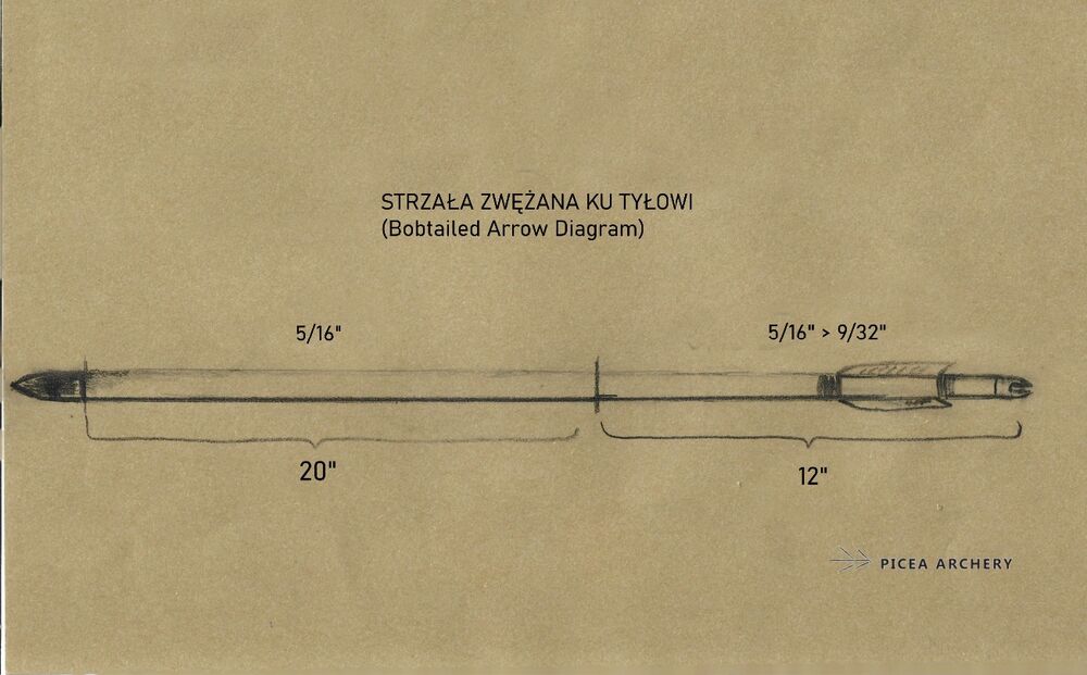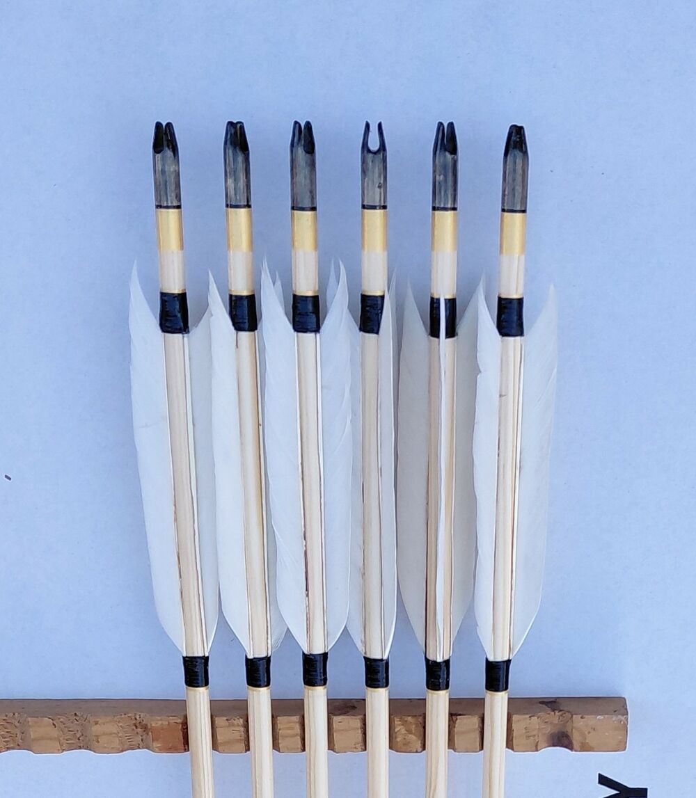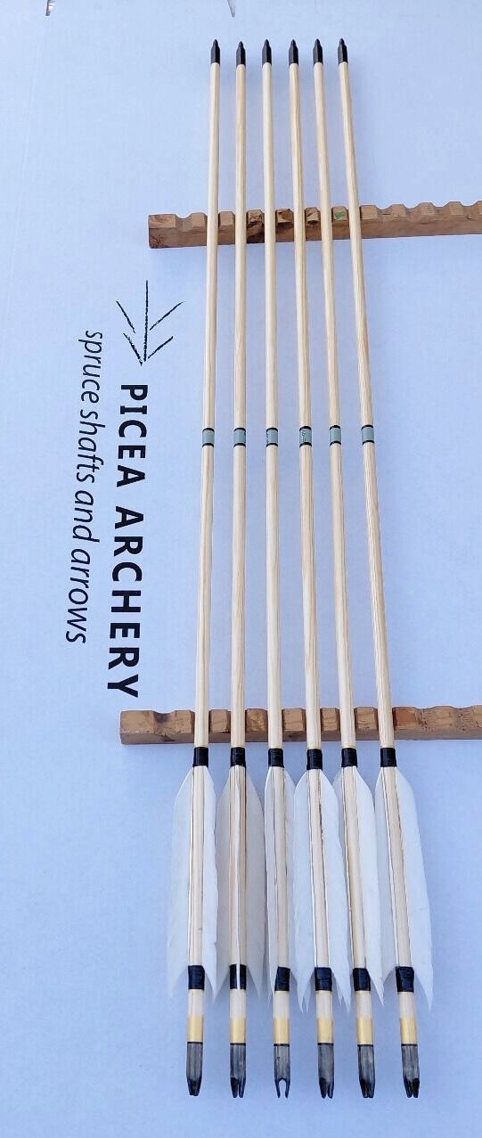 Diameter: 5/16″ → ~9/32″ (≈7.94 → 7.0 mm)Available wood: pineNock: wooden (self-nock)Fletchings: natural goose feathers, 4–5″ (low-profile, uncut, natural shape)Points: 100 gr